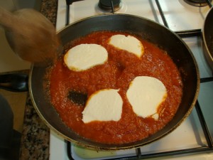 De primero, un aperitivo consistente en unas porciones de mozzarella de búfala enterrados en una fritada de tomate y cebolla, ajustado con especias al gusto (geranios por ejemplo).