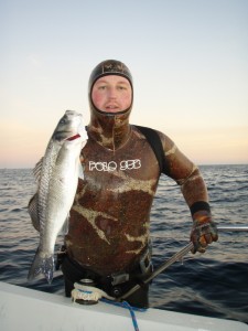 Llegamos a la zona y fondeamos el navío, mientras yo me preparo para la inmersión, Ramón se acurruca en un resquicio de la bañera para abordar una pedazo de siesta. Me tiro al agua y el ambiente es muy bueno, profundidad de 12-14m, visibilidad algo reducida, y mucha boga y castañuela. Muy interesante. Con el Robalo95 en la mano me dispongo ha acechar por el fondo entre la piedra rota. Tras unos cuantos acechos, al final de una de las esperas adivino en la lejanía la silueta inconfundibles de los labios de un Breadote. Aguanto un poquito más y entran en escena mis amados dentones, muy recelosos. Tengo que subir ya y lo más silenciosamente posible voy dejandome llevar por la flotabilidad.