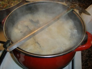 De primero, una sopa espectacular, con los dos sargos, la espina y cabeza de la lubina y los restos de una docena de gambones. Todo puesto a hervir un buen rato chof chof chafando bien la materia prima para un caldo de intenso sabor.