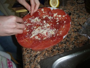 De aperitivo un Carpaccio de solomillo de ternera con parmesano.