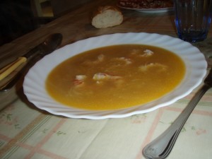 Luego unos fideos y antes de servir se añaden los gambones crudos que se hacen en un momentico con el calor de la sopa.