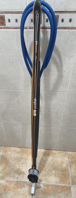 Fusil picasso magnun BW carbon 105 con carrete picasso lleno de dynema, doble goma meandros 14mm y varilla salvimar capture de 6.5mm (yo he tenido el mismo modelo de fusil y admite perfectamente varilla de 6.7mm o 7 mm 10 cm mas corta debido a la excelente flotabilidad del tubo en forma hueso de sepia), es un bisturi de fusil polivalente y que nuevo con carrete lleno se va cerca de los 380 eu.