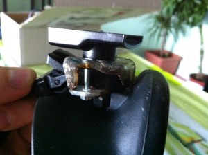 Por último ya podemos agujerear esta placa de metacrilato para poner un tornillo que ya si, sujeta el soporte lateral deslizante que viene en el paquete de accesorios de la cámara. Al poner solo un tornillo centrado, nos permitirá corregir el ángulo de inclinación con respecto a las gafas. Se puede añadir alguna junta de goma para que al apretar quede firme.